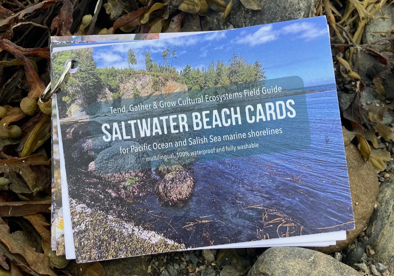 Our Tend, Gather and Grow curriculum development team found great joy in researching and writing the Cultural Ecosystems: Saltwater Beaches overview and lesson. It took years to finish because there is so much to focus on including types of beaches, tidal zones, and the plants and animals that adapt to constantly changing forces between land and sea. It took another two years to finish the Saltwater Beach Cards. These feature 23 common plant and animal species with photos, key characteristics, and fun facts, as well as resources for tending the ecosystem health of shorelines, and sources for further reading. Names for each plant and animal appear in English, Latin, Klallam, Northern Lushootseed, and Southern Lushootseed. The cards are durable and waterproof, and can be ordered from Chatwin Books. We will release a printable version on the Native Plants and Foods Curriculum Portal in early December.