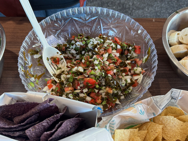 We spent half a day cooking in teams and shared a delicious meal including seafood stew with nori, pickled beach asparagus, cucumber seaweed salad, bullwhip kelp pico de gallo and chips, herring roe salad, halibut baked in seaweed, and chocolate ocean pudding with raspberries and a hazelnut crust. Presenters shared Coast Salish stories and insights on how to care for saltwater beaches through restoration and ethical harvesting practices. For example, the Muckleshoot Tribe and Swinomish Tribe have active clam gardens, and Suquamish Tribe is restoring cockle populations. See a video about the Swinomish clam garden here.